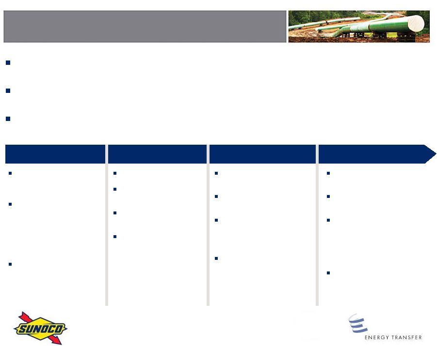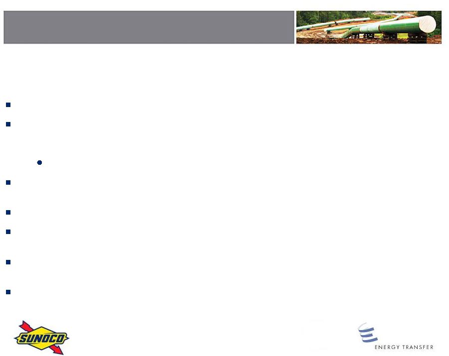 The transaction has been approved by each companys board of directors and is expected to close in the third or fourth quarter of 2012, subject to approval of Sunoco shareholders and customary regulatory approvals. Following the closing, Sunoco and Sunoco Logistics Partners will operate under the Energy Transfer Equity, L.P. umbrella of companies. By acquiring Sunoco, ETP will own Sunocos general partner interest, limited partner interest and the incentive distribution rights in Sunoco Logistics Partners.